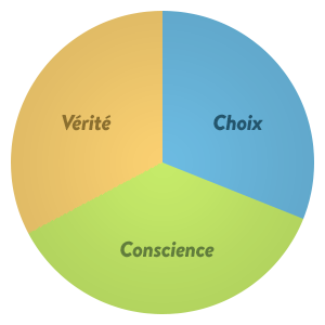 - Le Choix : le principe du choix entraîne celui de responsabilité. Tout ce qui se passe entre les personnes est le résultat des choix que chaque personne a fait – que le choix soit inconscient ou conscient. Chacun de nous est à 100 % responsable pour lui-même et de la situation, et nul n’est à blâmer.